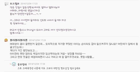 그래도 레몬테라스엔 애엄마 욕하는 댓글도 있지만 여대생까지 싸잡는 댓글도 있고 저렇게 여대생탓만 하는 댓글이 있는것으로 봐선 원글쓴이는 판에 올리지 말고 저런곳에다 올렸으면 그나마 자기가 원하는 것을 조금은 얻었을듯ㅋㅋ 맘스홀릭에 올라왔다면 어떨지 모르겠네