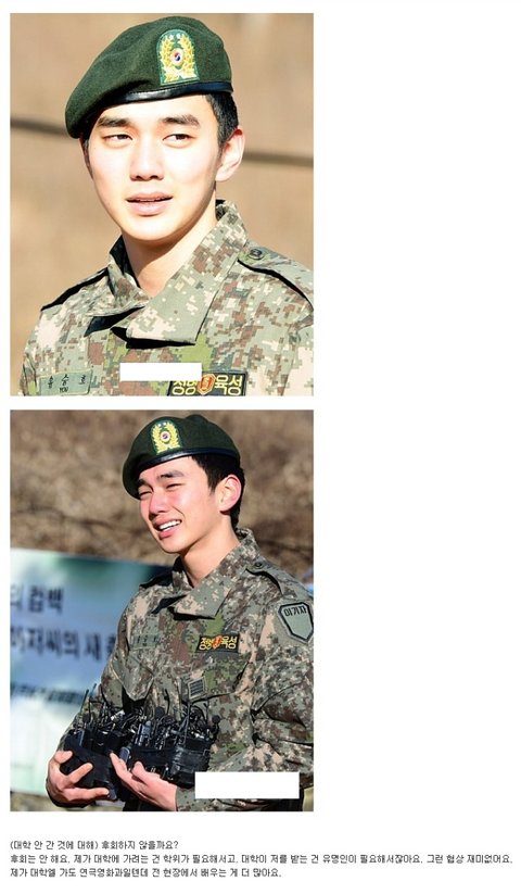 먼저 오늘 와주신 팬 여러분들 정말 감사합니다 날씨도 추운데 화천까지 오시느라 고생 많으셨습니다 솔직히.. 무슨 말을 해야 할지 모르겠습니다 전역했지만 왠지 다시 부대로 복귀해야 할 것 같고.. 썼다 지웠다를 반복하고 있습니다 입대하기 전 다른 연예인들이 전역할 때 '왜 울까'라는 생각을 했었던 게 생각납니다근데 왜 눈물을 흘렸는지 알았습니다 아까는 도저히 참을 수 없더군요 그 감정을 글로는 도저히 표현을 못하겠습니다 간부님들과 우리 후임 조교들의 환호속에서 나왔지만 20대 청춘을 국가에 봉사하는 제 또래 친구들이 아직까지도 훈련병들을 교육하고 있고 온갖 스트레스와 육체적 정신척 고통 답답함... 저 또한 21개월을 했지만 아직도 많이 남은 후임들을 보니 안쓰럽고 또 너무 고맙고 소장님께 감사하고 그저 먼저 가는 게 미안하고 훈련병들을 교육하면서 선임들한테도 많이 혼나고 제가 후임들도 많이 혼내고 많은 일이 있었고.. 정말 많은 일이 있었고 그 추억들은 우리 10중대 조교들만이 영원히 간직할 수 있는 좋은 추억입니다 이 추억들이 주마등처럼 스쳐가니 눈물이 그냥 쏟아졌습니다 그리고 팬분들 수많은 카메라를 보니 2차로 터졌습니다 기사 봤는데 온통 울고 있는 거 밖에 없네요