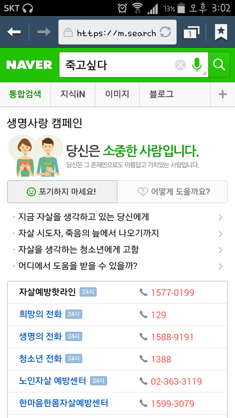 나도 예전에 죽을까말까 검색했더니 저거 나옴. 저럴때는 네이버 좋음