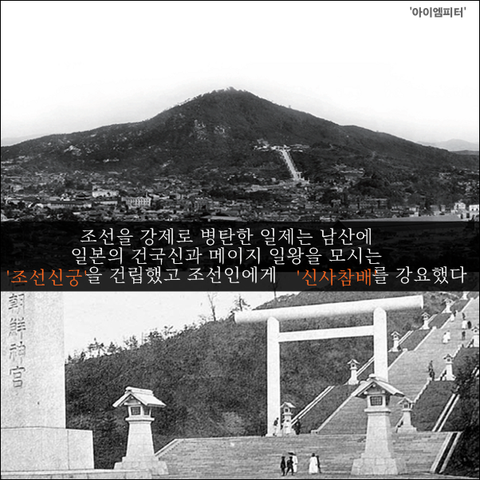 조선을 병탄 [각주:1]한 일제는 남산에 일본의 건국신인 '아마테라스 오미카미'와 '메이지 일왕'을 모시는 '조선신궁'을 건립합니다.