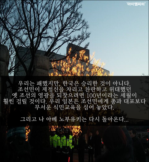 1945년 조선총독부의 마지막 총독이었던 아베 노부유키는 '조선이 승리한 것이 아니라 일본이 패했다'고 했습니다. 그리고 '나 아베 노부유키는 다시 돌아온다'며 조선을 떠났습니다.