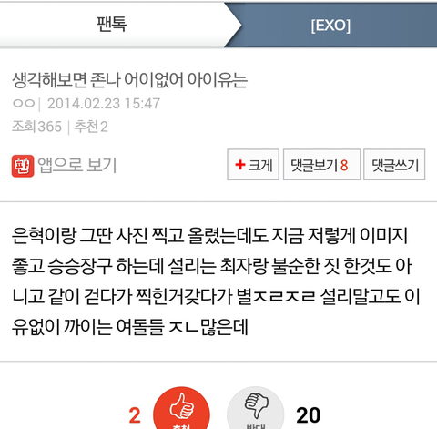 톡톡에서 아이유검색하면서 글보고있는데 엑소팬톡에서 겁나 아이유를 까대는거임;;