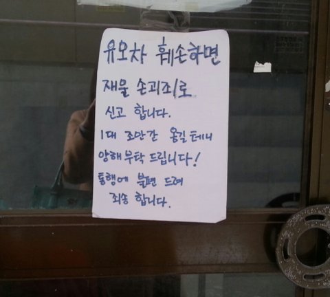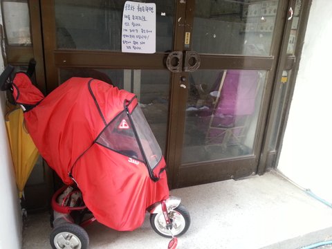 원래는 저 바깥에 있는 빨간 유모차가 지하로 내려가는 계단 앞쪽에 놓여져 있었고 그것때문에 지하에 사는 분이 통행에 방해 되니 치워달라고 했답니다.