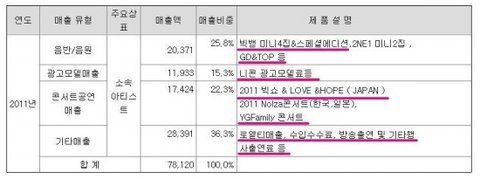 * 기타매출 : 빅뱅 사진전 작품 판매, 뱅곰 등 굿즈 판매수익 반영