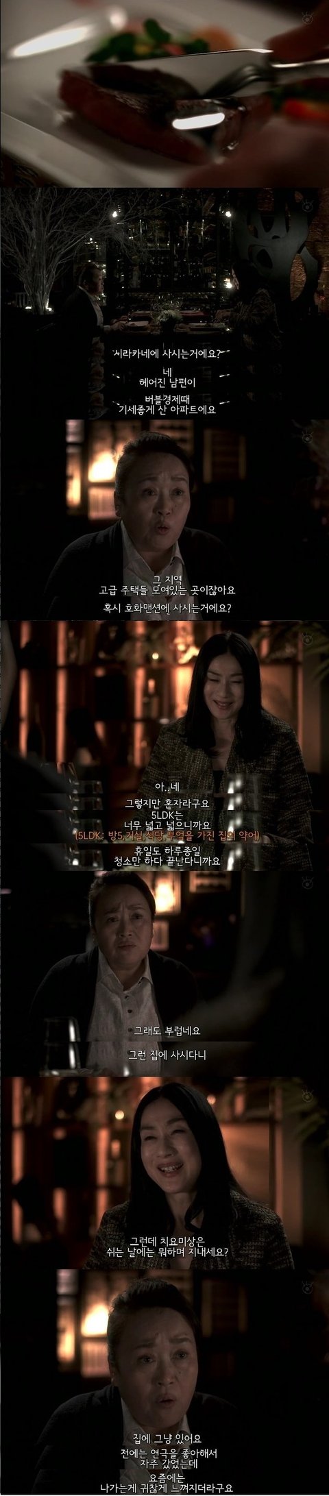딱봐도 고급스로운 레스토랑에서 식사를 하며, 대화를 나누는 여주.