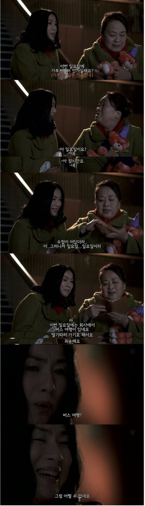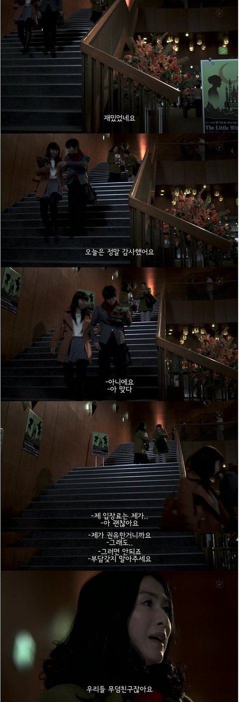 여주에게 목도리를 선물하며 그여자는 같이 식사를 했을때 여주가 한마을 기억하고 연극을 보러 가자고함. 조금 꺼름칙 했지만, 그래도 정많은 사람이라 생각한 여주는 따라 나섬.