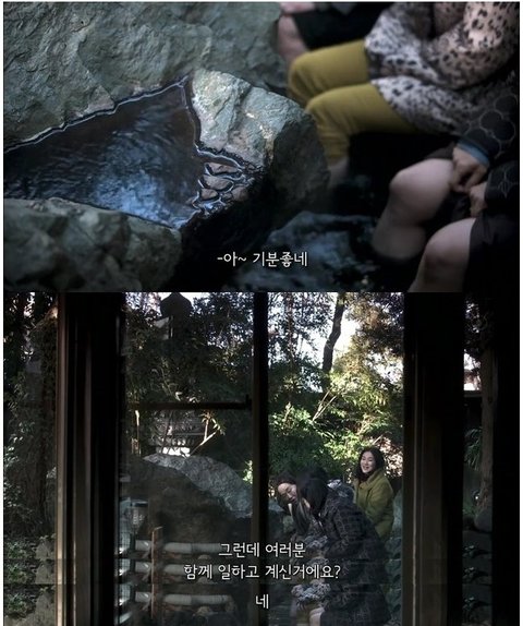 딸기 농장 투어를 하다가 계곡(?)물에 발을 담그며 쉬는 여주일행.