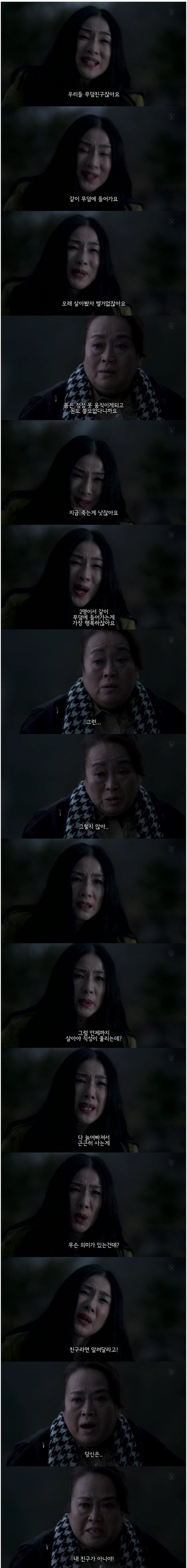 늙은 몸으로 근근히 살기 보단 나와함께 같이 무덤에 들어가자는 그여자에게 당신은 내 친구가 아니라하는 여주.