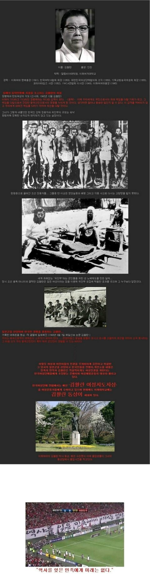 이름 : 김활란 출생 : 인천 학력 : 컬럼비아대학원, 이화여자대학교 경력 : 이화여대 명예총장(1961), 한국여학사협회 회장 (1959), 대한민국여성단체협의회 조직(1959), 기독교방송국후원회 회장(1955), 코리아타임즈 사장(1952), YMCA연합회 이사장(1949), 이화여대총장(1945) 일제의 침략전쟁에 지원을 호소하는 김활란의 여성 징병제와 반도여성의 각오(신세대, 1942년 12월 김활란) 이제야 기다리고 기다리던 징병제라는 커다란 감격이 왔다. (중략) 이제 우리에게도 국민으로서의 최대 책임을 다할 기회가 왔고, 그 책임을 다함으로써 진정한 황국신민으로서의 영광을 누리게 된 것이다. 생각하면 얼마나 황송한 일인지 알 수 없다. 이 감격을 저버리지 않고 우리에게 내려진 책임을 다하기 위하여 최선을 다할 것이다. 그녀가 그렇게 내몰았던 한국인 강제 징용자와 위안부의 규모는 워낙 광범위해 정확한 숫자조차 파악되지 않고 있는 실정이다. (사진) 탄광촌으로 끌려간 조선 징용자들... 그들중 반 이상은 영양실조와 폐병 그리고 각종 사고로 다시는 고향땅을 밟지 못했다. (사진) 세계 유래없는 :위안부"라는 군일들을 위한 성 노예제도를 만든 일제... 당시 조선 총독 마이런와 결탁한 김활란은 같은 여성이라는 점을 이용해 위안부 모집에 탁월한 효과를 내쓰며 그 누구보다 앞장섰다. (사진) 일본군을 찬양하며 한국인 징병을 종용하는 김활란... 거룩한 대화혼을 명심 -적 결말에 일로매진 (1943년 8월 7일 매일신보 논문 김활란) 우리는 배속으로부터 대화혼의 소유자가 되어야한다... 존엄하옵신 황실을 받들어 모시고 생사를 초월하며 대군을 위하여 순국 봉사하는 그 마음 오직 우리 황국신민만이 특히 제국 군민만이 경험할 수 있는 바이다. 이렇듯 여성과 어린이들의 인권을 무자비하게 유린하고 학살한 그 당시의 일본군을 찬양하고 한국인들을 전쟁터, 위안소를 내몰은 민족의 반역자 김활란은 역설적이게도 여성인권을 위한다는 한국여성단체들에게 추앙받는 존재이며 여성해방운동의 대모라 불리고 있다. 한국여성단체 연합에서는 매년 -김활란 여성지도자상- 을 여성운동가들에게 수여하고 있으며, 현재에도 이화대학교에는 김활란 동상이 세워져있다. (사진) 이화여대의 김활란 박사 동상. 매년 수천명의 이대 졸업생들이 그녀의 동상앞에서 졸업사진을 찍고있다. (사진) "역사를 잊은 민족에게 미래는 없다."