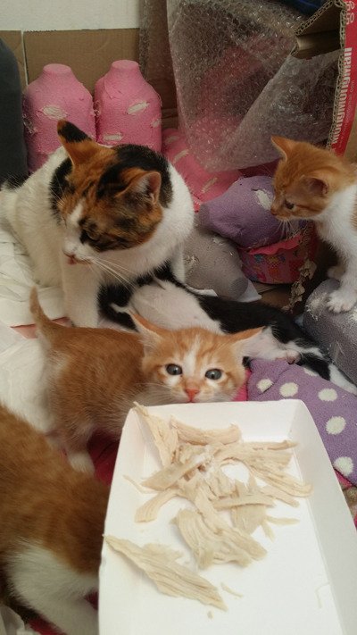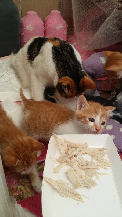 우리 꼬물이들도 어디서 맡았는지 닭고기 냄새에 하나둘 모이기 시작합니다.
