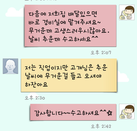 저는 혼자 사는 직장인이라 물이며 생필품이며 이것저것 많이 시키는데 기사님 얼굴 한 번 못 봤어요. 그래서 저희 집 앞에 기사님이 택배 올려놓고 가시는 작은 서랍장 같은게 있는데 거기다가 음료수 넣어놓고, 택배 알림 문자에 답장으로 '기사님 늘 감사하고 집앞 서랍장에 음료수 있으니 챙겨드세요~' 라고 문자드렸어요. 그날 밤에 확인해보니 음료 챙겨가셨더라구요. 그 다음부터는 고가품인것 같은 택배는 집앞 과일집에 일부러 맡겨주시구, 출장때문에 며칠째 집앞에 택배가 있으면 걱정해서 전화도 주시더라구요. 명절처럼 택배대란인 시기에는, 급한 택배 아니면 이웃집에 택배 배송할때 갖다주셔도 된다고도 말씀드리곤 해요. 서로서로 힘들고 고달픈 서민인데 웃으면서 조금씩 짐 덜어주면서 살면 좋겠어요. ^_^