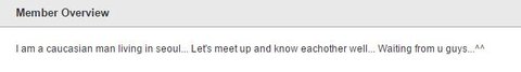 난 서울에 사는 백인 남자임... 만나서 서로에 대해 잘 알게되고 싶어요. 연락 기다릴게요 ^^