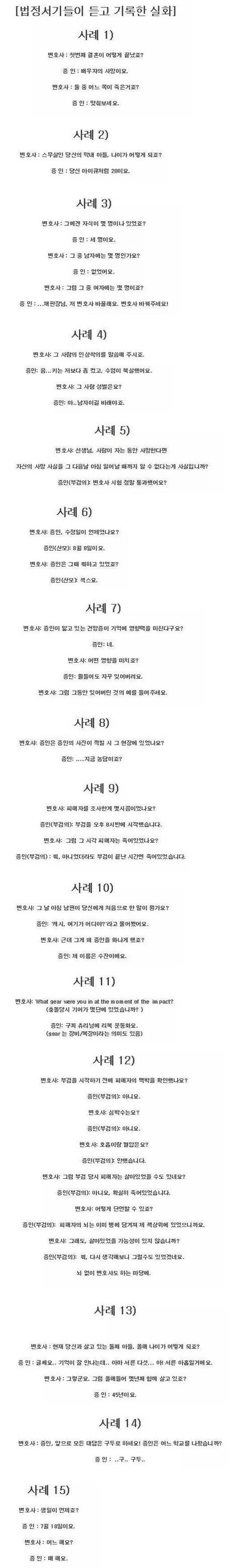 변호사가 당연한걸 묻는거는 증인이 위증하는지 알려고 하는거라는데 저질문들은 너무하네 ㅋㅋㅋㅋㅋㅋㅋㅋㅋㅋㅋㅋㅋㅋㅄ들만 모아 놓은듯