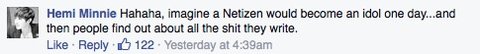 해석: ㅋㅋㅋㅋㅋㅋㅋ 어느 네티즌이 아이돌이됬다고 생각해봐...그리고 세상사람들이 그 네티즌이 쓴 "shit"을 막 찾겠지?