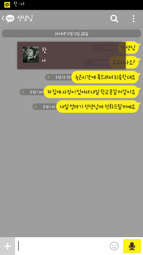 자려도해도 잠은 안오고 어짜피 이런상태로는 학교못갈꺼같아서 제가 먼저 카톡으로 선생님께 내일학교못갈꺼같다고 말씀드렸어요.그리고 내일 엄마한테 선생님께 전화해드리려하려고요.
