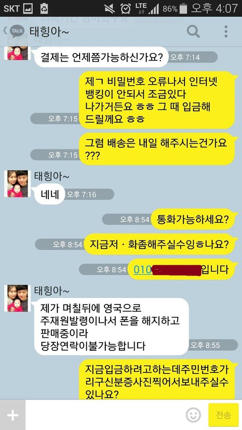 입금하기 전, 전화번호를 물어보았으나