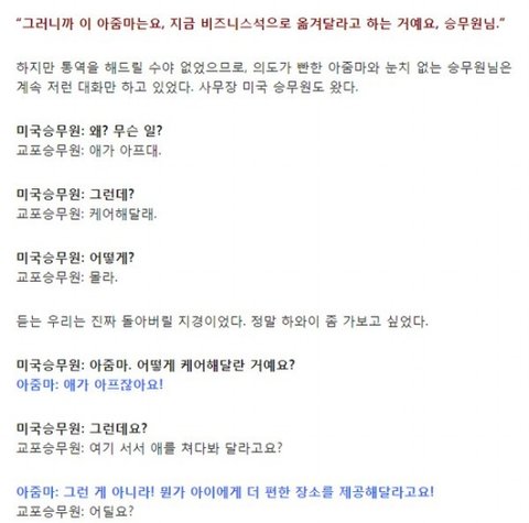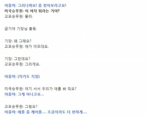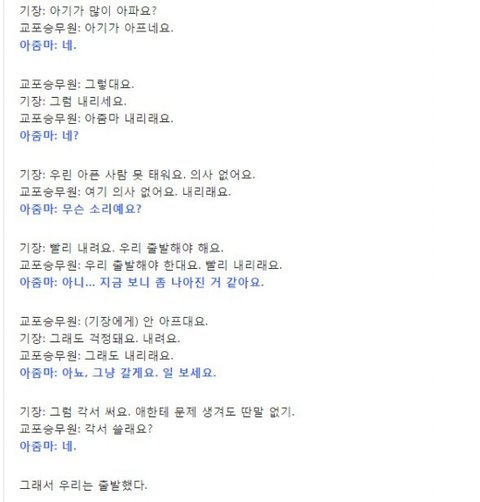 저도 외국항공사 승무원인데요 이런일 가끔있어요. 한번은 한국으로 들어가는 비행기에 손님이 타셨는데 한국여자분이 자기 임신중인데 의사가 위험하다고 그랬다면서 비지니스로 업그래이드를 시켜달라는 식으로 말씀을 하셨어요. 이코노미랑 비지니스는 세배이상 차이가 날 뿐더러 그냥 그렇게 업그래이드를 시켜드리지 않거든요. 근데 이분 너무 강하게 그러셔서 매니져랑 캡틴이랑 인볼브되서, 비행기안에서 아프면 어느곳으로 연락하는데가 있거든요 아주 큰 메디컬센터같은곳이요. 거기다가 연락했더니 그분 오프로드시켜야 한다고 결정나서 그분 결국 한국못오시고 비행기에서 나가셨어요. 나가기 전에 아니라고 거짓말이었다고 그러시는데 결국엔 그렇게 됐답니다.