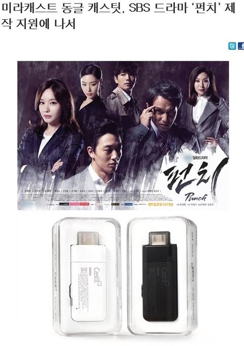 미라캐스트 제품인 '캐스팃'이 곧 방영될 '펀치'에 제작지원한다고 하네요! 스마트폰 화면을 TV로 볼 수 있는 미러링 기기라고 합니다.