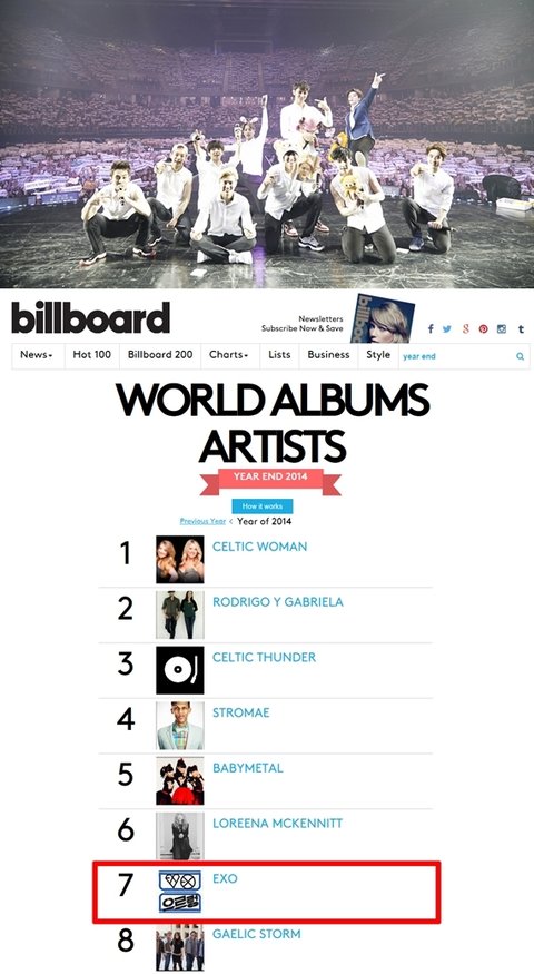 소속사인 SM엔터테인먼트는 지난 9일 빌보드가 발표한 ‘2014년 연말 결산 차트’(2014 YEAR END CHARTS)의 ‘월드 앨범 아티스트’(World Albums Artists) 부문에서 엑소가 7위에 올랐다고 12일 밝혔다.