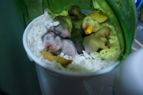 그리고 햄스터가 자기 새끼를 잡아 먹는 경우는 새끼가 선천적으로 약하게 태어나서, 또는 사람 냄새가 나서, 여기는 위험하니깐 나라도 살아야 해, 그런 일은 없겠지만 주인이 밥을 주지 않아 영양분 섭취가 필요함 등.