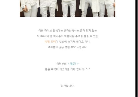 이번년도 3월달에 있었던 샤이니 콘서트가 라이브음원으로 앨범이 나옴. 공홈에 공지가 뜨고 앨범안에 히든트랙이 있다고 기대하라고 그럼