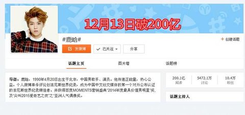 루한이 웨이보 해쉬태그가 200억을 돌파했대~
