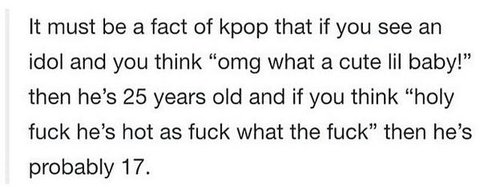 고삼수니.. 수능치기전으로 잠시 돌아가 어줍잖은실력으로 해석해본다며능.. k pop아이돌 가수들을볼때 당신이 오 쉣 왓더 아카짱 엉엉 이라고 생각한다면 그는 분명 25살 일것이고 ㅁㅊ 개섹시 존트섹시 ㅁㅊ 날가져 라고 생각한다면 그는 17살일것이다 오역 의역있숴여 우리 아카짱 사랑해여