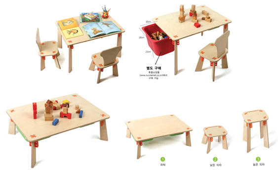 아이들의 성장 단계에 따라 좌탁, 책상, 의자 등으로 변형할 수 있는