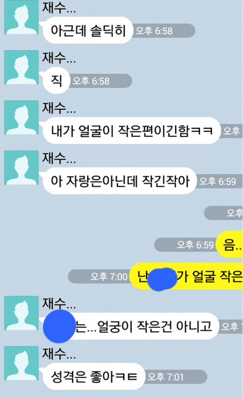 얼굴 진짜 안작아요.솔직히 좀 큰편?큰편은 아닌데 엄청 길어요.보통 달걀형의 얼굴이 좀 길다지만 얜 작은게 아니거 엄청길어요ㅋㅋㅋ그리고 이 카톡내용은 제가 다른애 얼굴 작다하니까 인정안하고 자신이 더 작다거...이런애 어떻게하죠...?