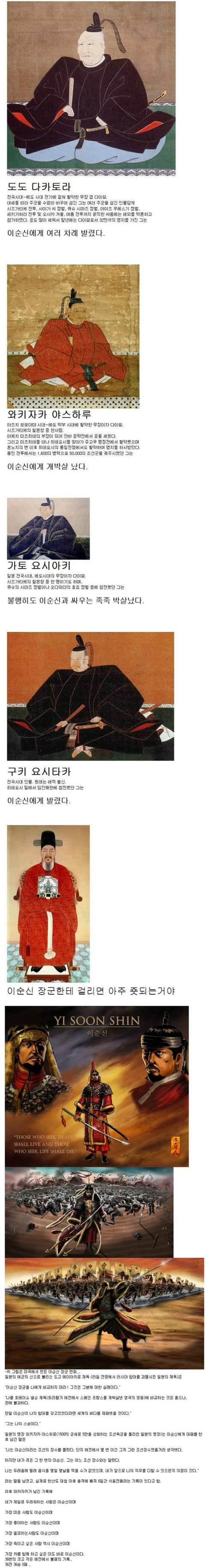 이순신의 전술은 프랑스 해군의 전술 교범에도 수록되어 있습니다(학익진, 불가능에 가까운 역전 등) 임진왜란이 끝나고 서애 류성룡은 이순신의 명량해전을 회고하며 이런 말을 남깁니다.'왜는 수륙병진전략(육지에서 힘든 보급을 수군을 통해 동시진행)을 위해서 명량의 길목을 돌파해야만 했다. 이순신이 그 한 싸움을 이기지 않았다면 명의 원병이 도달할 수 없었을 것이고 조선의 앞날은 없었을 것이다' 올 해 명량 영화는 이런점이 표현되진 않았더군요 영화에서 나온 것 보다 이순신의 업적은 더 대단한 것입니다. 그가 없었다면 우리는 지금 일본어를 쓰고 있을지도 모르지요