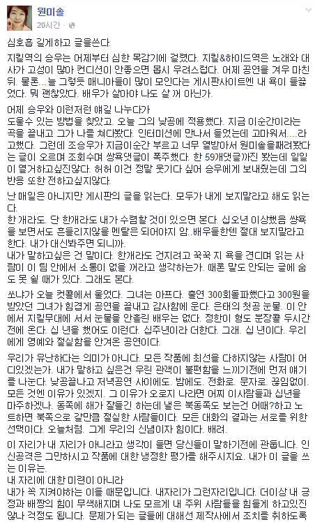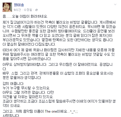 그러던 중, 15일 새벽에 이런 글이 지앤하 음악감독인 원미솔 음악감독의 페이스북 페이지에 올라오게 됩니다.