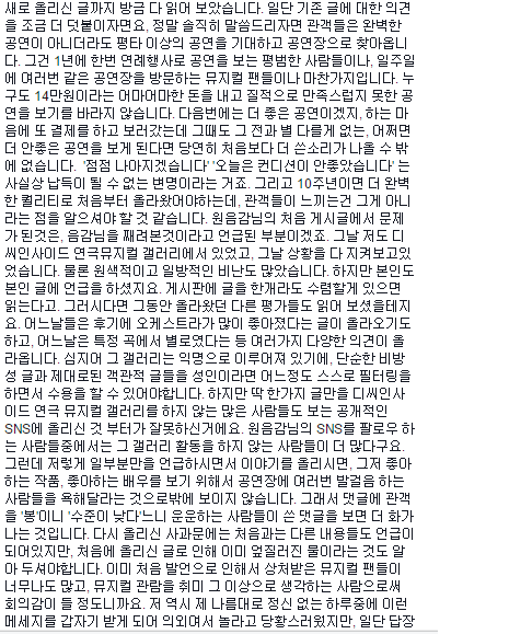 대다수의 댓글이 이 3가지 흐름이였습니다. 그중 마지막은 대부분 어그로성 댓글들이였고, 비중도 그리 크지 않았습니다. 평소 지앤하 오케스트라와 음악감독에 대해 쌓인게 많았기 때문에 그 글에 대한 반응도 굉장히 핫했었죠.