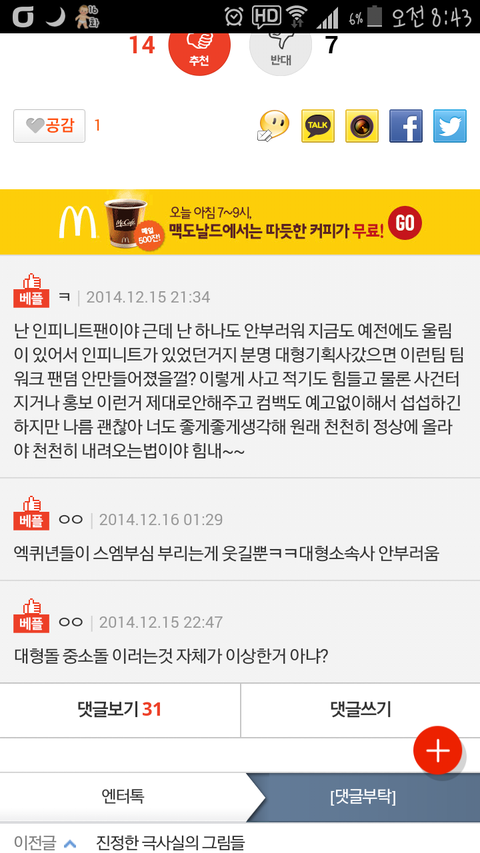엑퀴엑퀴 거리지 마 ㅅㅂ 그리고 겁나 스엠이 열심히 키워서 이렇게 멋진 컨셉이랑 노래를 내주는데 당근 스엠부심 부려야지 난 어제부로 또한번 닥치고스엠찬양 중이다 ㅅㅂ 어쩔래 숭고한 엑소와 스엠 까지 말란말이다 저딴게 배플이라니ㅡㅡ