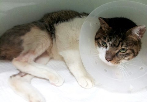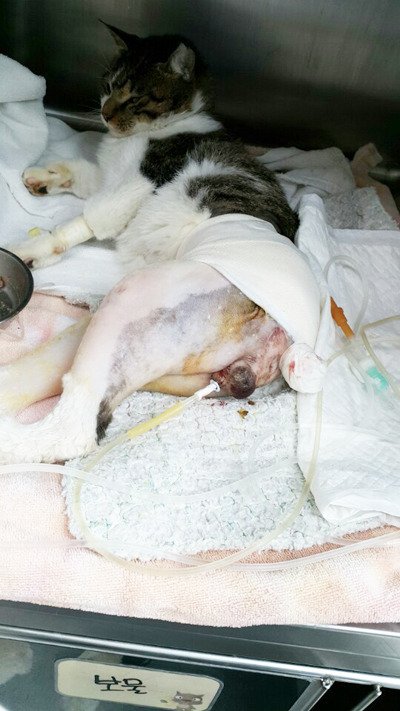 길냥이 특성상 사람을 보면 재빠르게 숨고만 싶었을 텐데 다친 뒷다리 때문에 몸이 말을 듣지 않으니