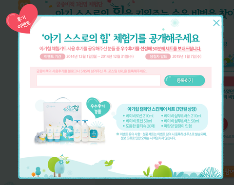 얼마 전, 베이비스킨케어 브랜드인 궁중비책에 신청한 3천 명 체험단 1차 1,000명에 제가 당첨되었거든요^^