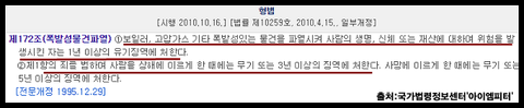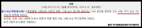 대한민국 형법 제119조에서는 <폭발물을 사용하여 사람의 생명, 신체 또는 재산을 해하거나 기타 공안을 문란한 자는 사형, 무기 또는 7년 이상의 징역에 처한다>고 되어 있습니다.
