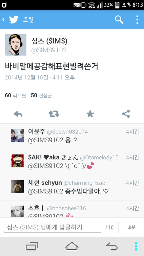 일단 심스가 바비한테 디스했다고 심스욕하고난리던데 아이콘팬인데도 심스가불쌍해서 글올림ㅇㅇ.. 지금 심스가바비디스했다고 욕많이먹던데 판에서 욕하고깔시간에 심스트윗이라도 들어가보지 그랬심 심스는 절대바비를디스한게아니라 바비가 타가수디스한것에 공감한다고 표현빌려쓴거라캄 진짜 심스는 공감해서 표현빌린건데 욕존,나먹고있어서 안타까움 이거보고 다들 바비랑심스욕자제했으면ㅇㅇ