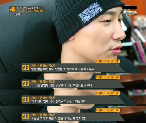 - 언더그라운드 활동 경험이 있는 지코 입장에서 그런 포메이션을 갖추고 시작한 목적 자체가 좀 더 많은 사람들에게 자기 음악을 들려주고 싶어서겠지? 두 마리 토끼를 다 잡고 싶은 건가?