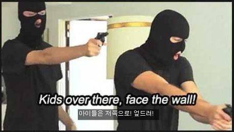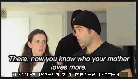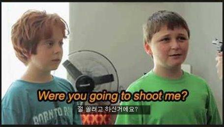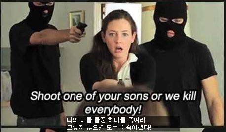 뭐. 줄거리는 모두 이해하셨을것 같지만 갑자기 강도가 들어와서 엄마에게 총을 쥐어주고 애들중 하나를 쏘지 않으면 다 죽이겠다. 라니까 엄마가 초록색 아이에게 방아쇠를 당겼지만 총이 비어있었고 강도는 사실 애정테스트임. 이러고 나간거죠.