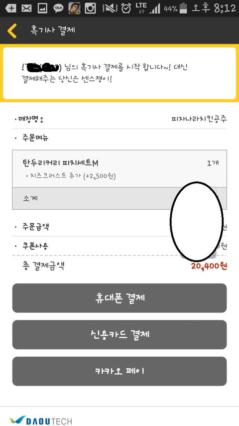 분명 제가 배달 365에서 치킨과 피자....피치세트를 흑기사 결제 요청했는데