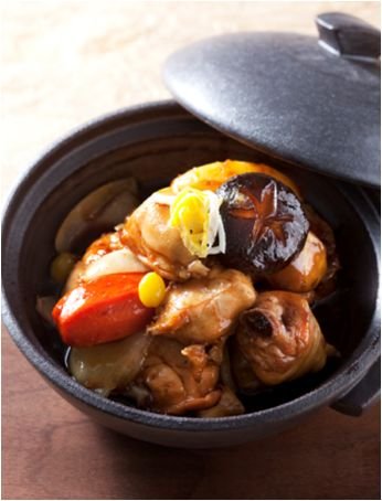 7.팬에 닭을 넣고 준비해둔 양념장을 반정도 붓고 센 불에 올려 끓으면 약한 불로 낮추어 20분 정도 끓이다가 남은 양념장을 넣고 감자, 당근, 양파, 표고버섯, 은행을 넣은 후 15분 정도 야채가 익을 때까지 끓인다.