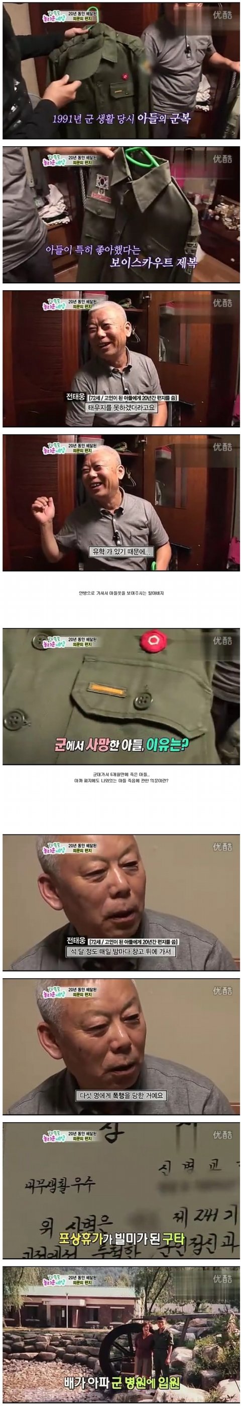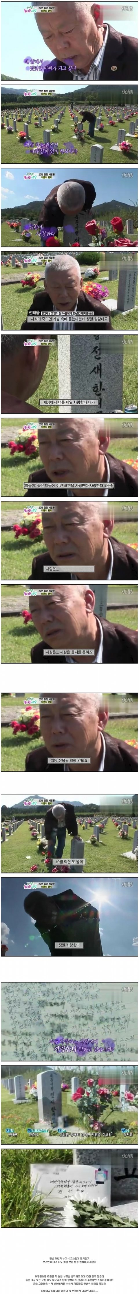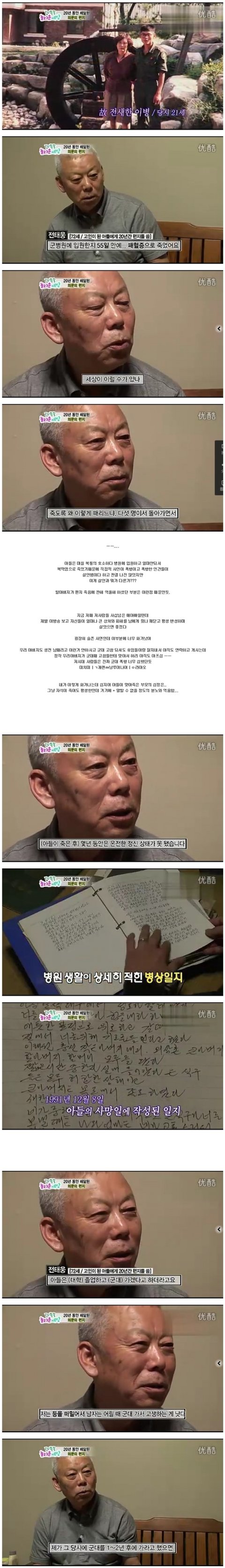 우연히 판을 보다 제목보고 혹시나 햇는데 우리 아빠더군요... 제가 고3때 오빠가그렇게 허무하게 가버렸는데 제가 지금 42입니다. 세아이의 엄마이기도하지요..수도병원에서 한달동안 아무것도 먹이지못하게하고 결국 굶어 죽은거나 마찬가지입니다 폐혈증으로 죽어가면서도 우린 아무도 오빠가 죽을거란걸 몰랐읍니다 죽기전날 걷지도못하던 아들이 첨으로 힘내어 휠체어에 앉아 부모님께 제대하면 세계여행을 시켜드린다했고 저에겐 졸업이니 옷을 사준다고 하였읍니다 어린맘에 너무 좋아 오빠가 빨리사줬으면 좋겟다 생각했엇는데 그게 마지막이였네요 담날 아침 오빤 중롼자실로 옮겨지고 위사선생님아 하시는말씀이 이주사를 맞으면 몇시간 더 살수는 있지만 고통이 넘 심하다 하셨읍니다.. 그말을 듣고 부모님은 오빨 보내주기로 하셨고 눈도 못뜨고 우리 얼굴 한번 보지도못했지만 오빠...잘가...라는말에 눈물을 흘렸읍니다..살아서는 한번도 부대에서 나오지 않앗던 사람들이 죽구 나서야 오더이다..