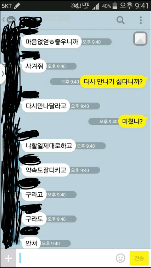 이런 애 어떻게 해야되죠? 진짜 다시 만나기 싫은데 자꾸 저러는데... 미쳐버릴거 같네요. 차단하면 문자 겁나 번호 이상하게해서 보내고 카톡도 무슨 아이디 계속 새로 만들어서 보내고 ㅋ