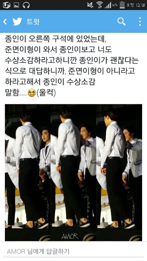 종인이 수상소감 챙겨주는 준면이ㅠㅠ