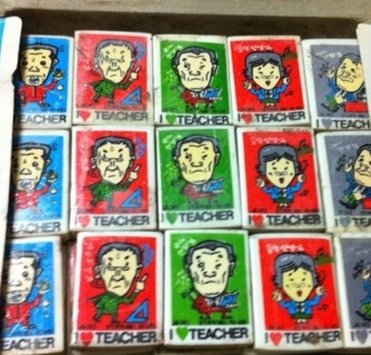 학교에서 친구들이랑 네모반듯한 아이러브티쳐 일명 '선생님지우개'로 지우개 따먹기 하고 운없는날 지우개 다 털리면 이를 악물고 눈물을 삼키며 엄마가 준 소중한 용돈으로 학교앞 문방구가서 새삥 선생님지우개를 몇개더 샀었음. 남자아이들 한테는 현금과도 같던 선생님 지우개...ㅋ