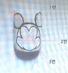2번은 미키얼굴 가운데에 1,2,3번 선이 겹처서 만들어진 △부분 보이시죠? 그 밑에 바닥선에 미키 코를 그린다고 생각하면 됩니다.^^