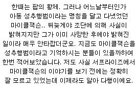 마이클 잭슨 팬클럽 활동 왕성히 하고있는 팬입니다 이런글너무 감사합니다 진짜....피부도 박피한게 아니라 백반증이라는 병때문에 그런거에요 여러분 마이클 잭슨 정말 착한 사람이었습니다 ㅠㅠ모르시는분들아직도 마이클잭슨 성형중독 마약 성폭행 피부박피 라고하시는분 많으신데 마음이 너무아픕니다 ㅠ -------------------- 베플감사합니다 ㅠㅠ아 슬프다