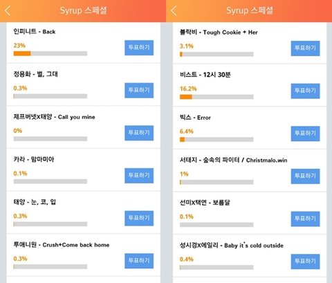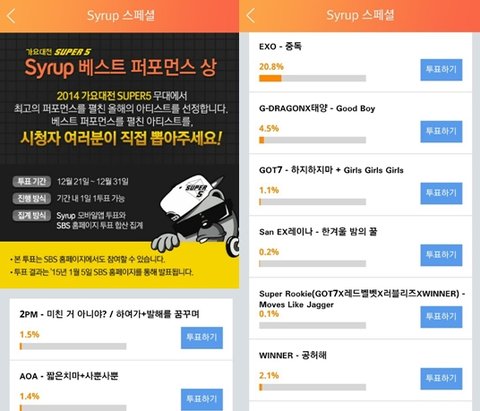 시럽에서 가요대전 베스트 퍼포먼스상 투표 받고 있더라구