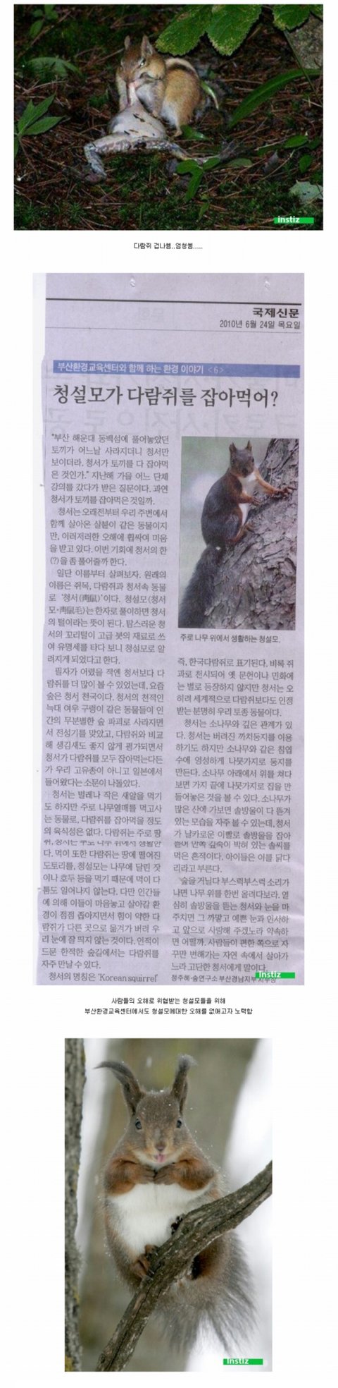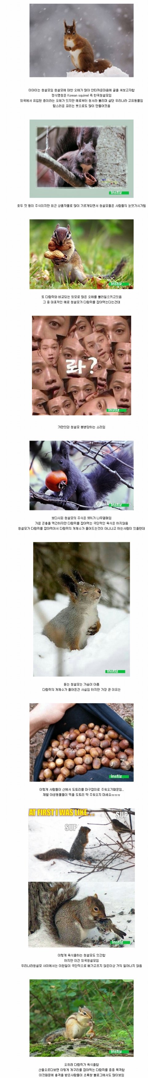와..예전에 산을 올라갈때마다 청설모를 봤었는데 어릴때는 청설모를 되게 싫어했음. 정확한 이유는 모르겠는데 다람쥐를 잡아먹는다고 해서 싫어했던것 같음. 그때 당시 다람쥐가 귀여워서 좋아했는데 청설모는 무섭게 생겨서 더 싫어했던것같음. 무튼 지금까지도 청설모를 별로 안좋아했는데 이제 다시보니 청설모도 귀엽게 생겼다ㅋㅋㅋ쫑긋 선 것처럼 보이는 귀도 귀엽고 다 귀엽네ㅋㅋ그리고 청설모가 귀여운 다람쥐를 잡아먹는다고 싫어했었는데 다람쥐도 같은 다람쥐를 잡아먹기도 함.. 지금까지 미워해서 미안해 청설모야ㅜㅜ
