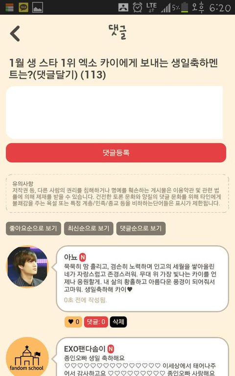 팬덤스쿨 앱에 카이한테 생일축하메시지 보내는거 떴어